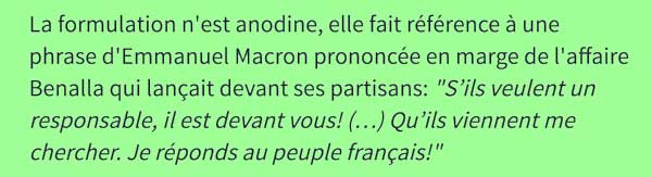 Emmanuel Macron avait lancé : « S’ils veulent un responsable, il est devant vous ! […] Qu’ils viennent me chercher. Je réponds au peuple français ! »