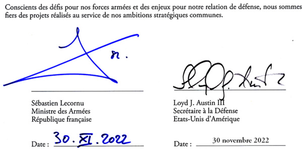2. — LANGUE. Parmi les belles fautes de ce document officiel de Defense.gouv.fr du 23 novembre 2022 : « DÉCLARATION [...] DE M. SÉBASTIEN LECORNU MINISTRE DES ARMÉES ET DE M. LLOYD AUSTIN SECRÉTAIRE À LE DÉFENSE DES ETATS-UNIS D’AMÉRIQUE », « nous entendo coordonner », « Loyd J. Austin » (signature).