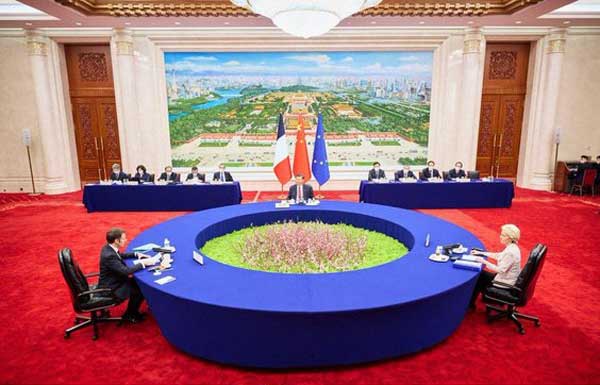 11. — 7 avril. Macron (https://archive.is/NCLth) une main dans la poche pour la photo officielle des trois présidents. Pas très solennel, un brin décontracté, désinvolte, voire insolent. La photo ci-dessous se trouve sur le compte Twitter de Macron, ce qui me rappelle la bourde du piédestal (voir l’alinéa 21) – mais s’agit-il ici d’une bourde ou bien Macron a-t-il voulu manifester son mécontentement après les humiliations chinoises ?