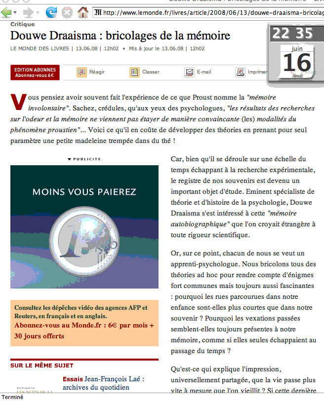 Jean-Louis Jeannelle sur www.lemonde.fr commence ainsi son article : « Vous pensiez avoir souvent fait l’expérience de ce que Proust nomme la “mémoire involontaire”. Sachez, crédules, qu’aux yeux des psychologues, “les résultats des recherches sur l’odeur et la mémoire ne viennent pas étayer de manière convaincante (les) modalités du phénomène proustien”... Voici ce qu’il en coûte de développer des théories en prenant pour seul paramètre une petite madeleine trempée dans du thé ! »