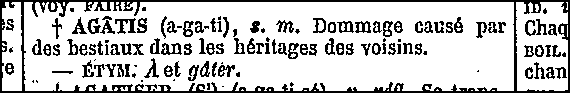 (Nouveau Larousse illustré, 1897, 7 volumes : agatis [sans circonflexe]. Dommage causé par des animaux sur le terrain d’autrui. [Image ici.])